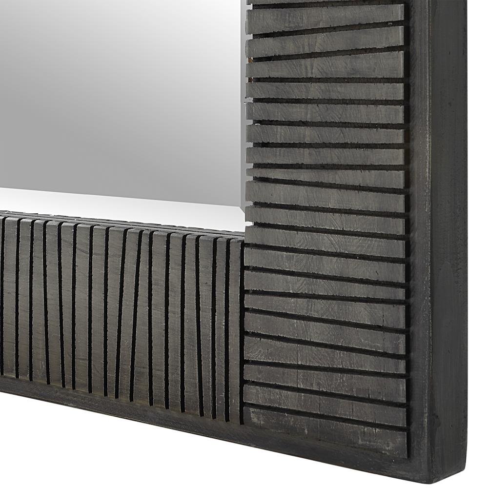 This Oversized Mirror Features A Solid Wood Frame with Hand Carved Channels Finished in A Rustic Wood Tone with An Aged Gray Wash. Mirror Has A Generous 1 1/4" Bevel and May Be Hung Horizontal or Vertical.