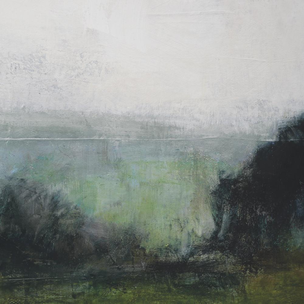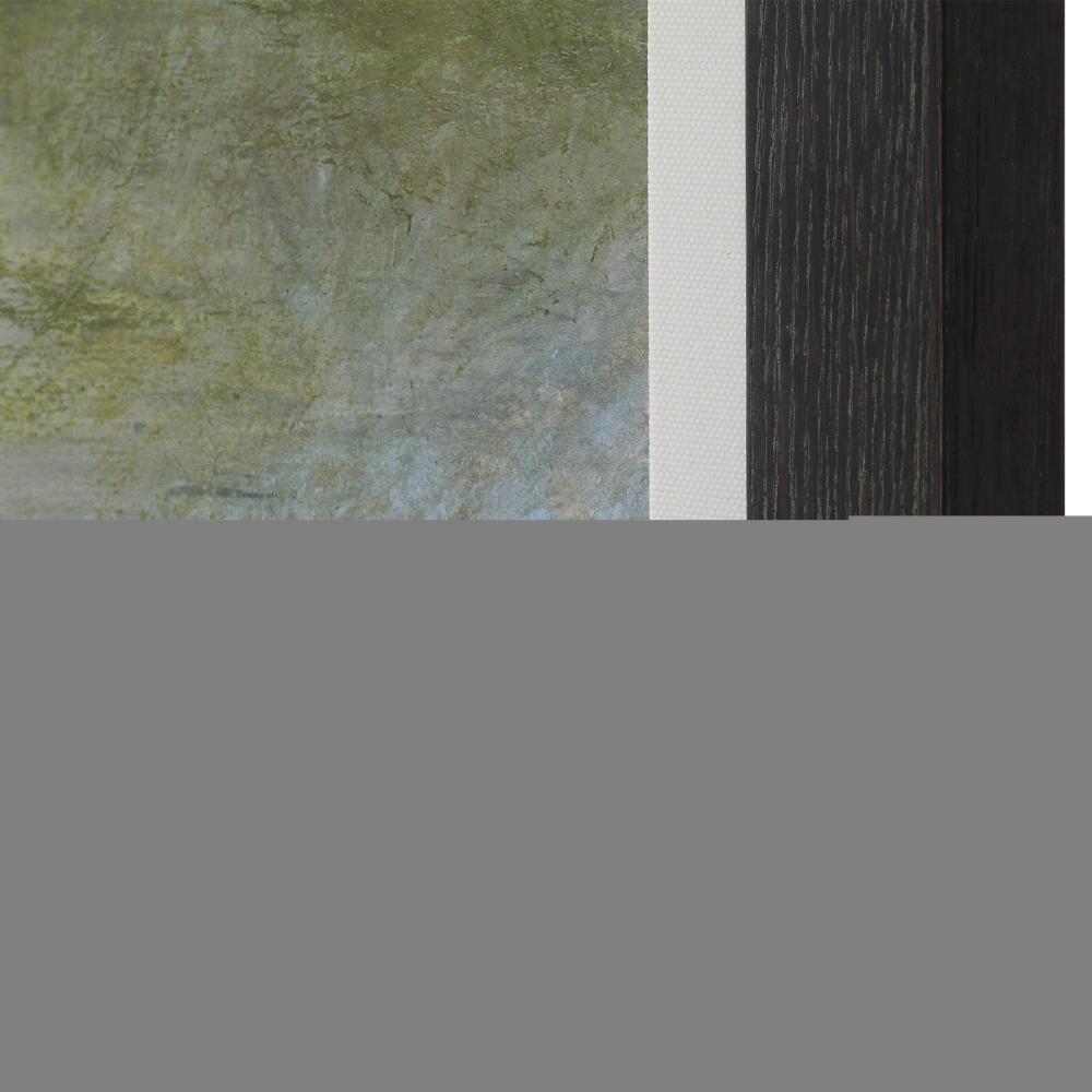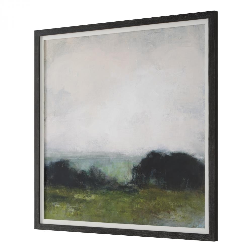 An Overcast Sky Dances Across Moody Shades Of Olive Green Earth And Shadow Black Trees. The First View Of The Water Framed Print Captures The Mysterious Beauty Of A Waterscape. Surrounded By A Black Wood Grain Frame Complimented With A White Linen Liner. Artwork By Julia Purinton.