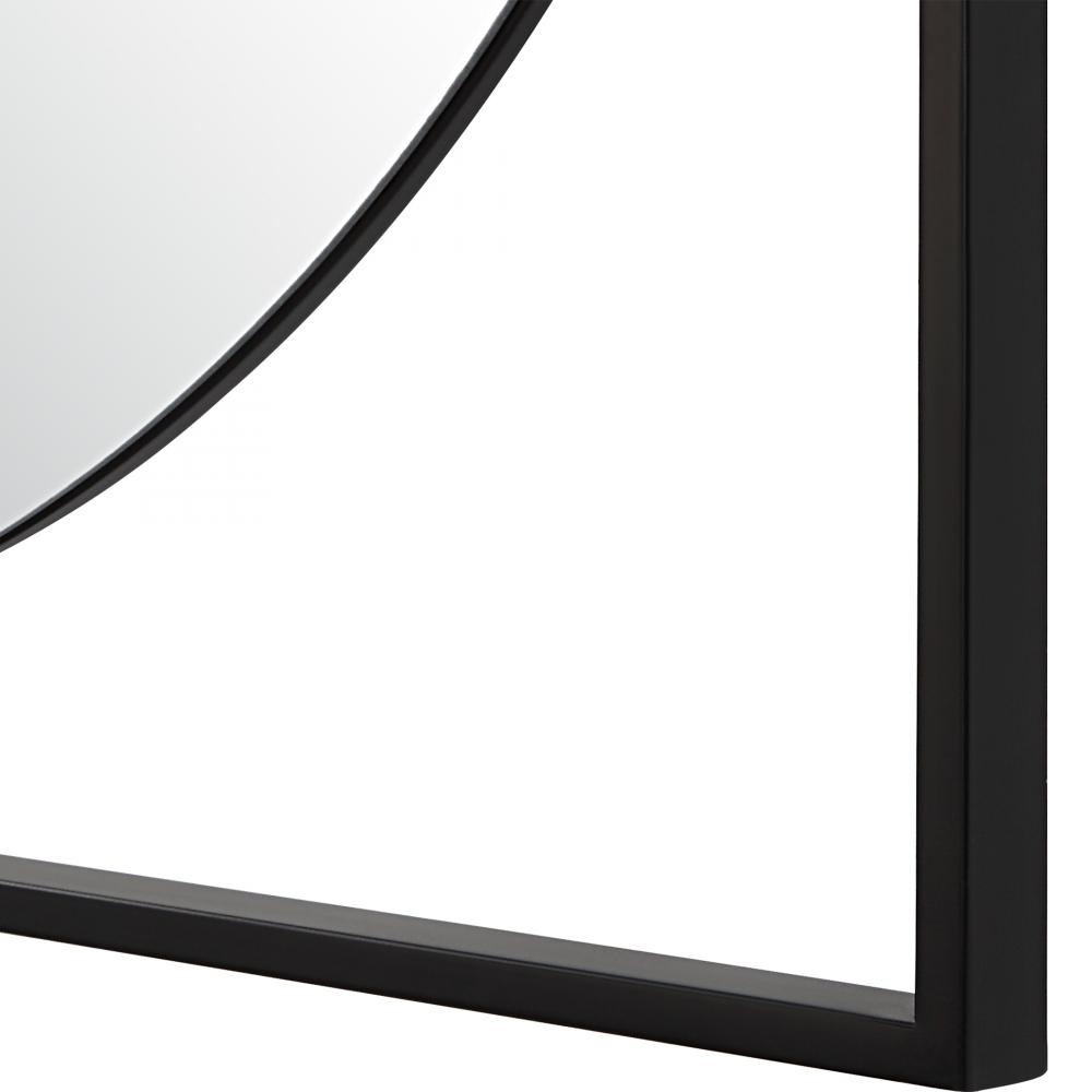 A Square Iron Frame Finished in Satin Black Surrounds A Suspended, Round Polished Edged Mirror, Held with Antique Gold Half Round Iron Bands.