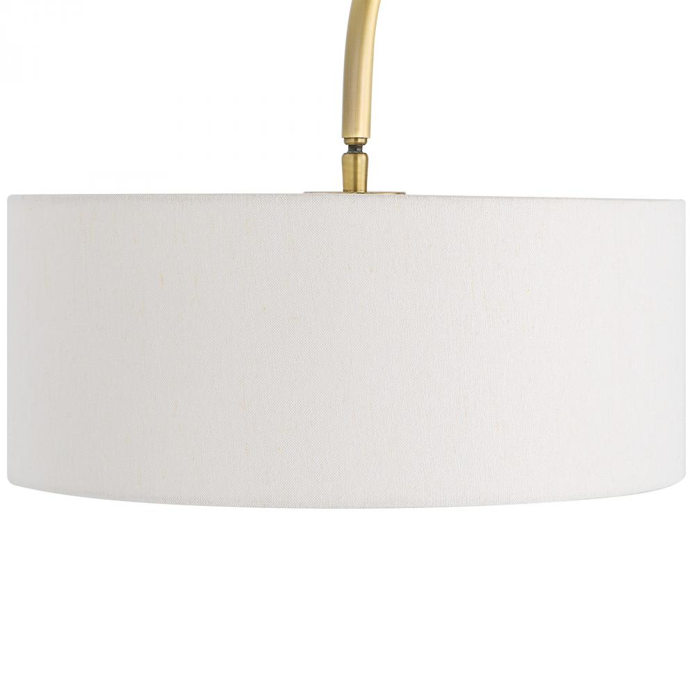 This Classic Arc Floor Lamp is Crafted From Iron Finished in A Plated Antique Brushed Brass, Accented By A Thick Black Marble Foot with Natural Veining. The Suspended Round Hardback Shade is Covered in An White Linen Fabric, Attached to A Pivoting Neck Allowing The Shade to Be Placed At An Angle If Desired.