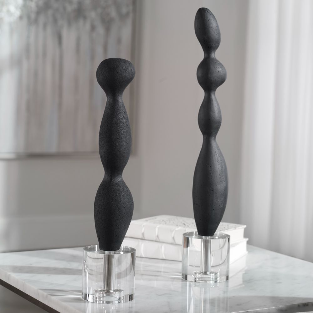 Set of Two Abstract Sculptures Made of Black Granulated Marble Set Atop Crystal Bases. Sizes: S-4x16x4, L-4x20x4.