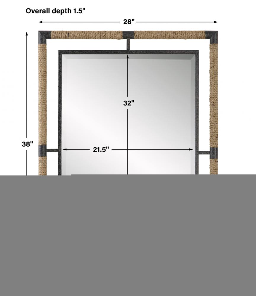 This Forged Iron Mirror Frame is Finished in A Textured Rust Black That is Wrapped in Natural Rope Bringing A Coastal Feel to Any Room. The Mirror is Surrounded By A Generous 1 1/4" Bevel. May Be Hung Horizontal or Vertical.