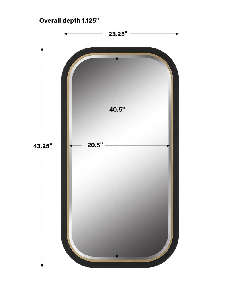 The Nevaeh Mirror Displays An Elegant Curved Profile with A Satin Black Finish, Accented with A Petite Gold Leaf Inner Edge. Mirror Features A Generous 1 1/4" Bevel. May Be Hung Horizontal or Vertical.