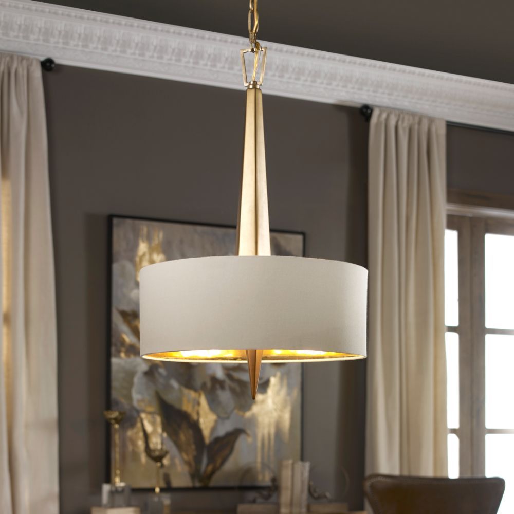 An Elegant Chandelier with A Sleek Vertical Ceramic Center in A Warm Gold Finish Evokes An Art Deco Feeling with A Beige Linen Hardback Shade Featuring A Gold Interior. 3-60 Watt Max, Edison Sockets. Bulbs Not Included. Supplied with 15' Wire and 7' Chain for Adjustable Installation.