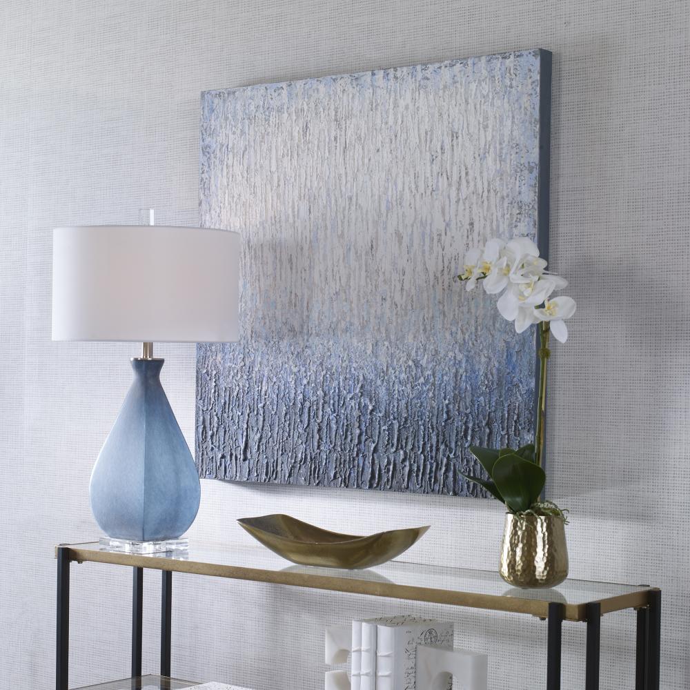 Contemporary Style Emanates From This Hand Painted Abstract Artwork on Canvas. This Piece Features Lush Texture Detailing in Rich, on Trend Blue Tones. The Monochromatic Tones Slowly Fade From Light Gray-blue to Deep Navy, Evoking A Coastal Feel. Each Canvas is Stretched and Attached to A Wooden Frame. Due to The Handcrafted Nature of This Artwork, Each Piece May Have Subtle Differences.