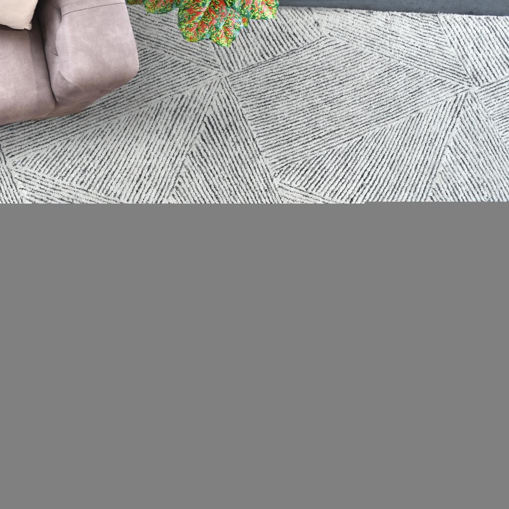 This Hand Tufted Rug Features Geometric Patterns with Linear Details in Ivory and Gray Wool in A Medium Cut Pile.