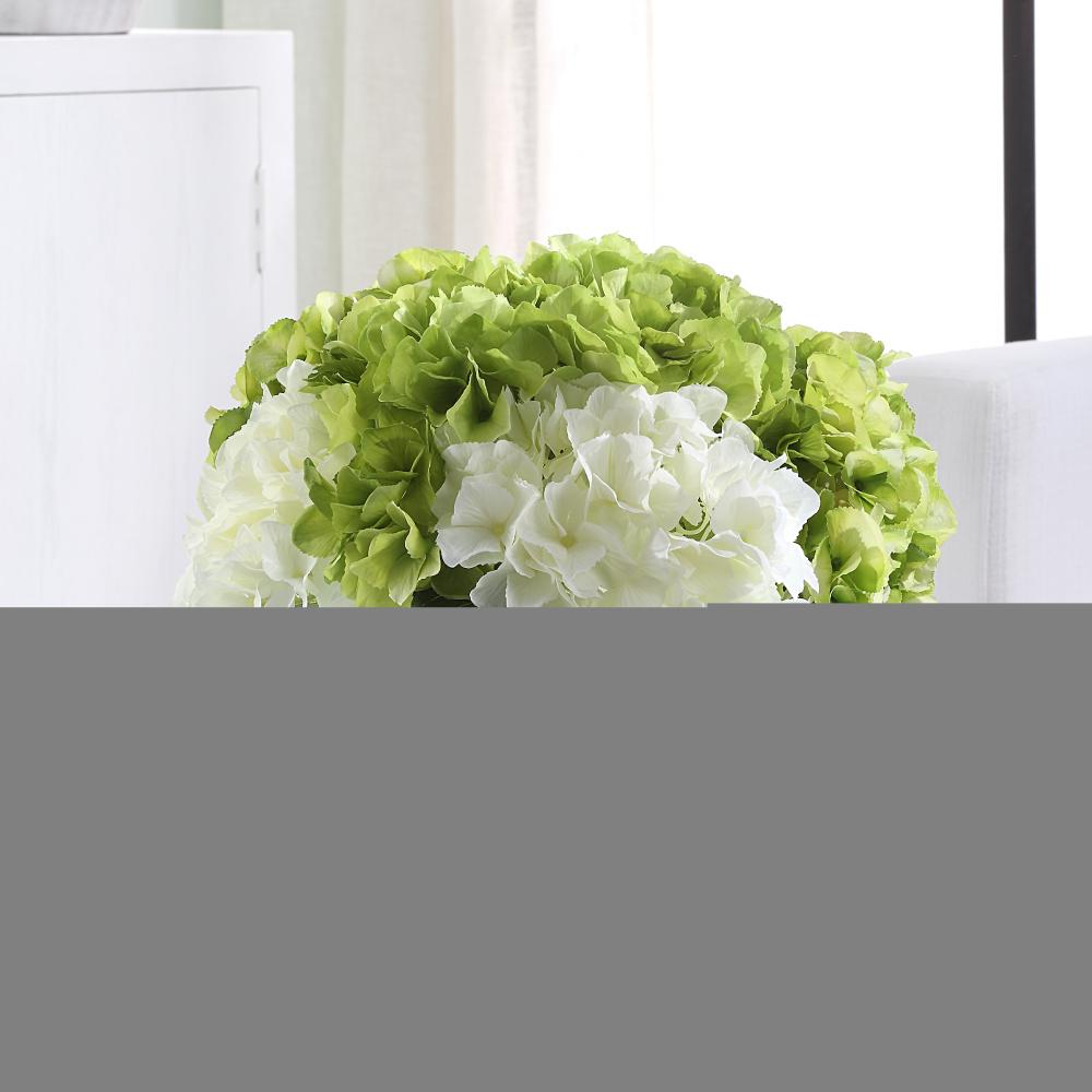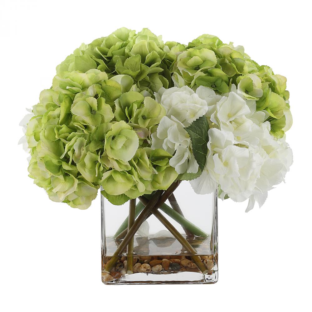 Filled with Large Summertime Blooms, The Savannah Bouquet Shows Off A Variety of White and Limelight Hydrangea Stems in A Square Glass Vase with Faux Water.