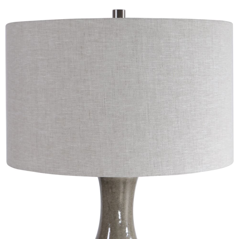 Showcasing A Bohemian Flair, This Ceramic Table Lamp is Finished in A Glossy Warm Gray Glaze That Transitions to A Heavily Textured Ivory Bottom. The Casual Contemporary Styling is Paired with Plated Brushed Nickel Accents. The Hardback Drum Shade is Light Gray Linen with Natural Slubbing.