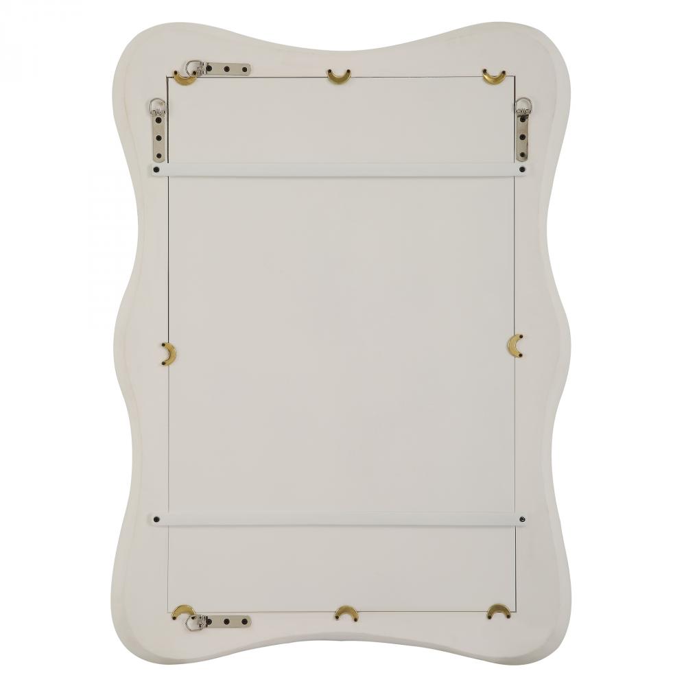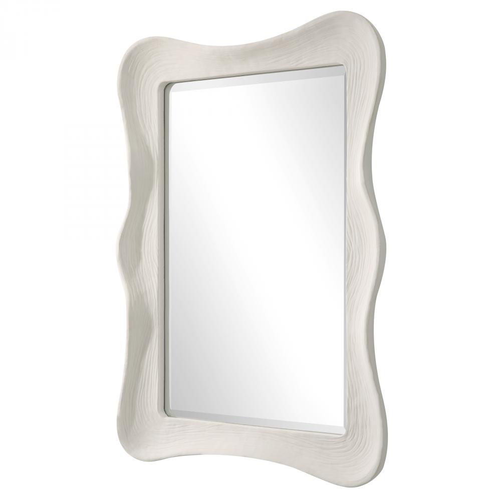 This Mirror Showcases A Contemporary Coastal Design with A Wavy Organic Shaped Frame Finished in Matte White with Noticeable Waves and Texture. Mirror Has A Generous 1 1/4” Bevel. May Be Hung Horizontal or Vertical.