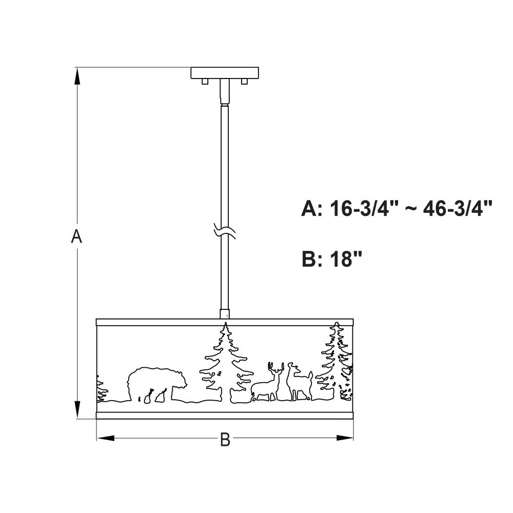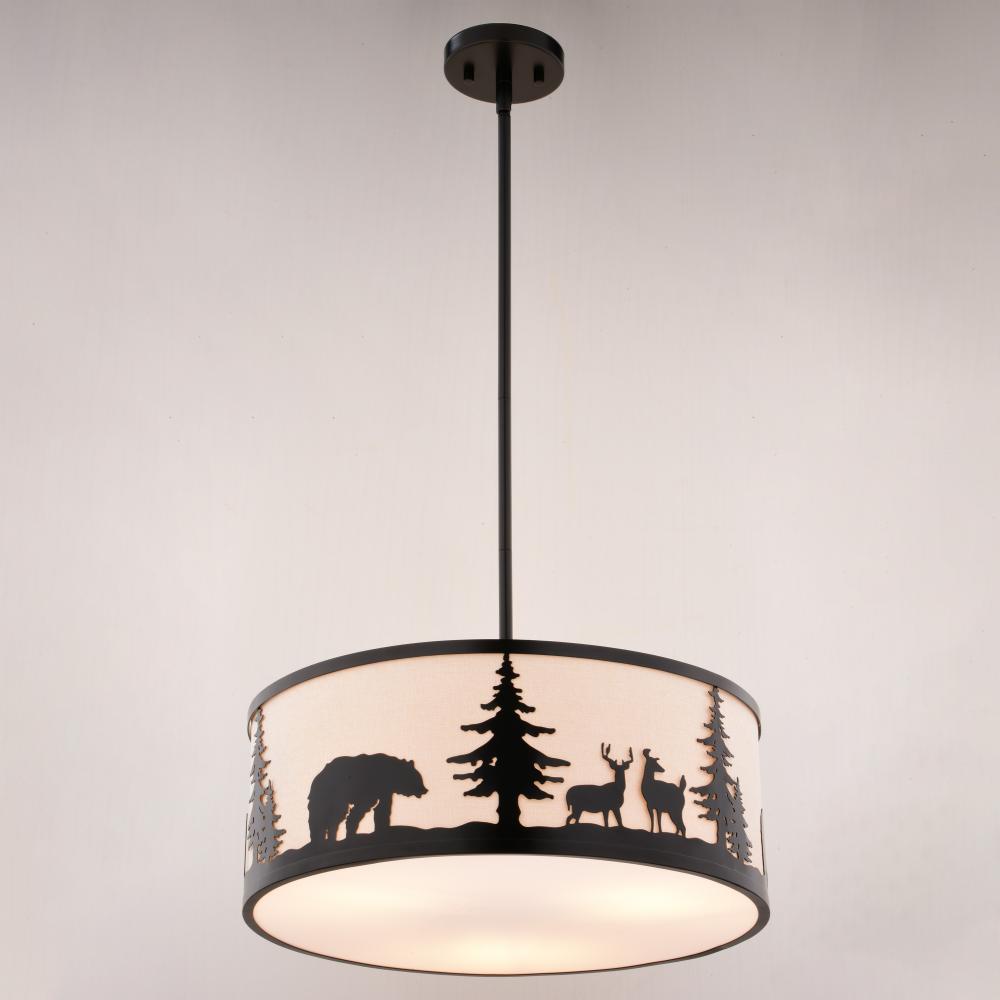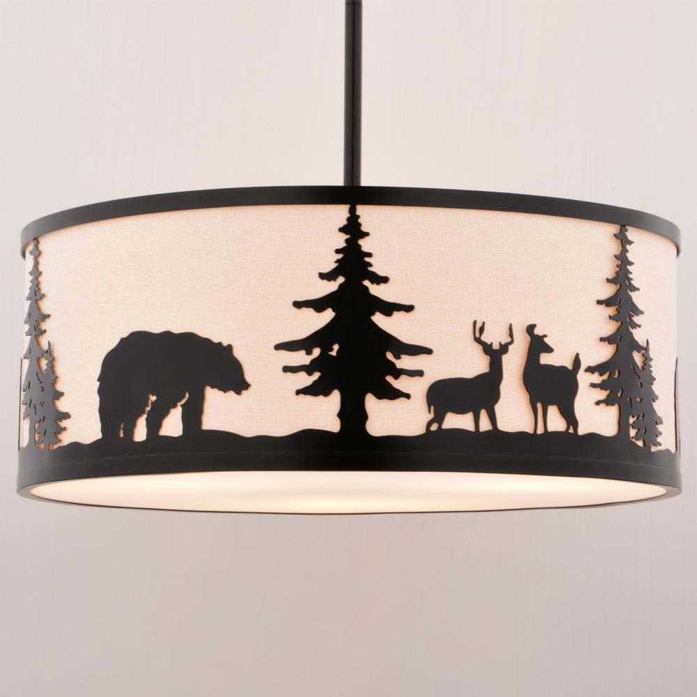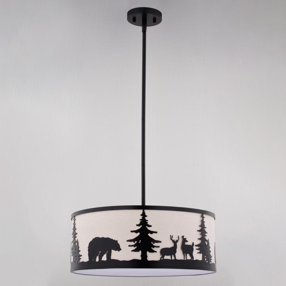 Embrace the serene whispers of the artfully crafted Acadia pendant to bring the essence of the wild into your home. The Acadia pendant's three lights and textured linen shade showcase bear and deer silhouettes set against a backdrop of evergreen trees. Perfect for kitchens or family rooms of cabins, lodges, or any home seeking to add a touch of nature and rustic ambiance.
