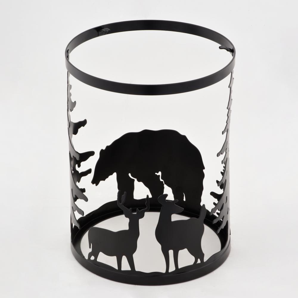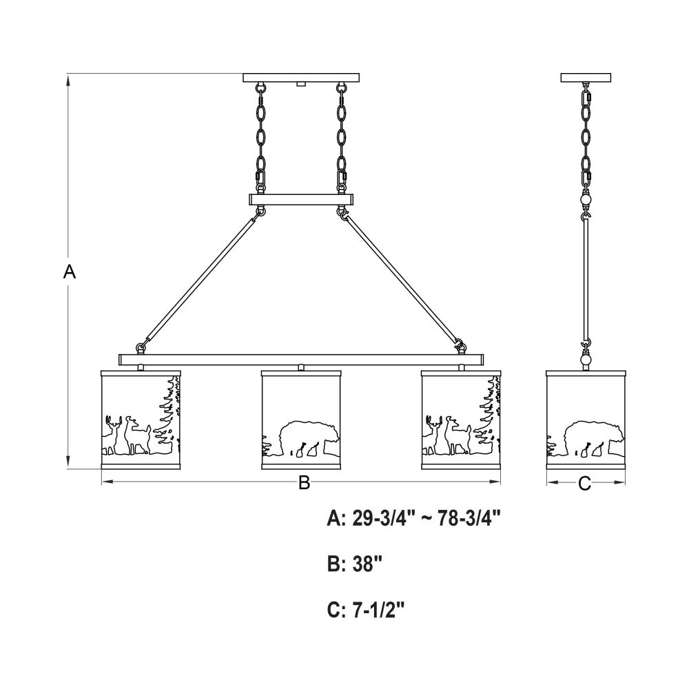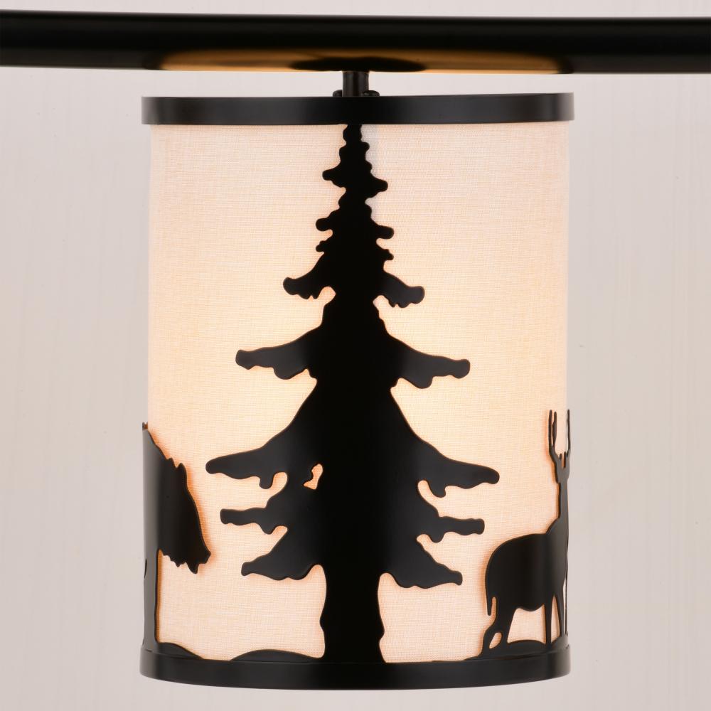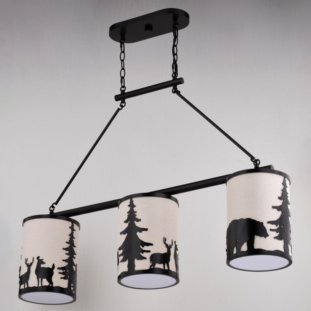 Embrace the serene whispers of the artfully crafted Acadia linear chandelier to bring the essence of the wild into your home. The Acadia's three lights and textured linen shades showcase bear and deer silhouettes set against a backdrop of evergreen trees. Perfect for kitchens or family rooms of cabins, lodges, or any home seeking to add a touch of nature and rustic ambiance.