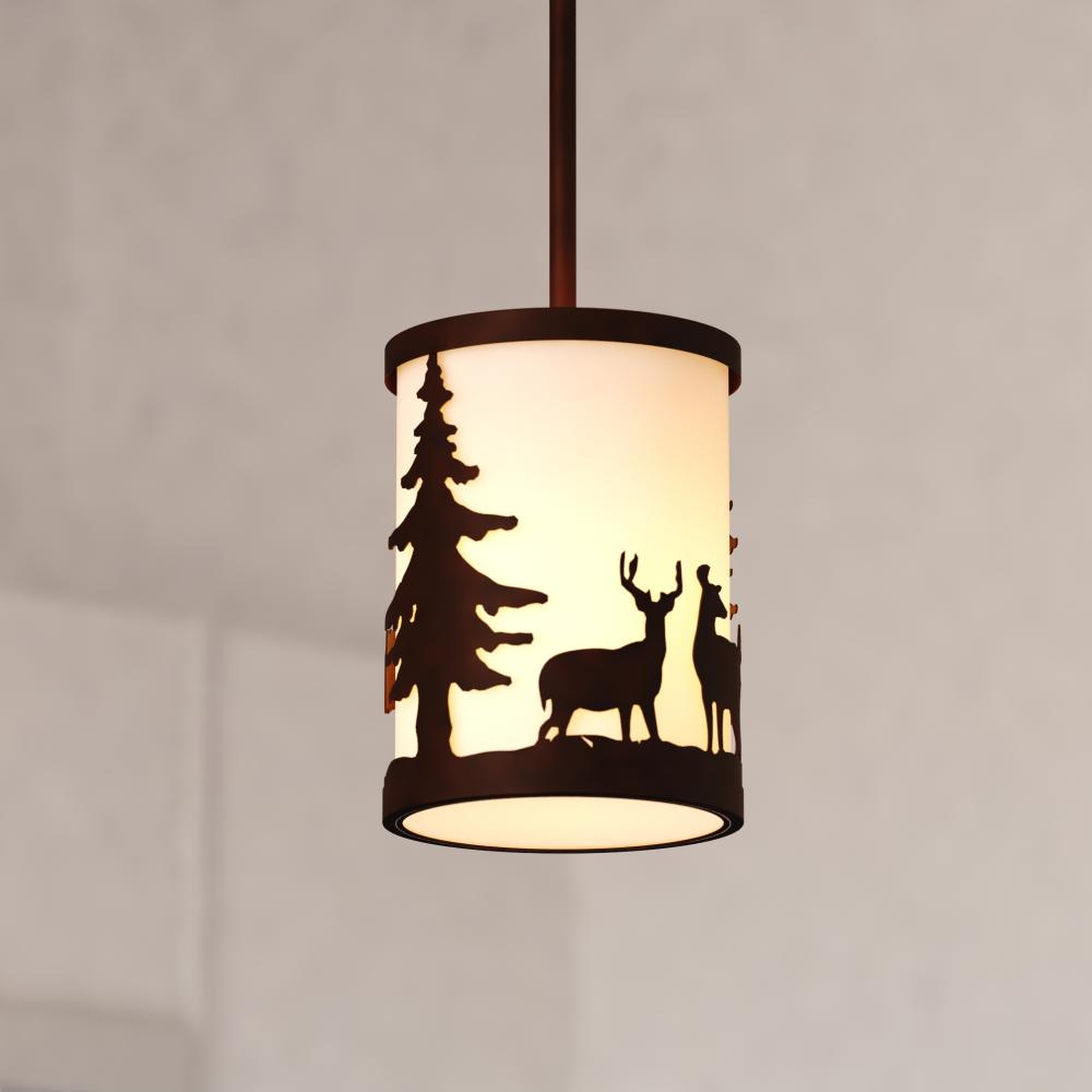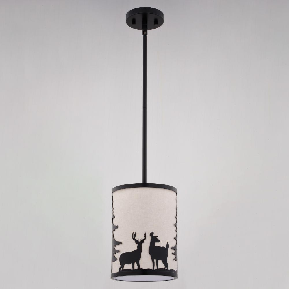 Embrace the serene whispers of the artfully crafted Acadia mini pendant to bring the essence of the wild into your home. The Acadia pendant's textured linen shade showcases bear and deer silhouettes set against a backdrop of evergreen trees. Perfect for kitchens or family rooms of cabins, lodges, or any home seeking to add a touch of nature and rustic ambiance.