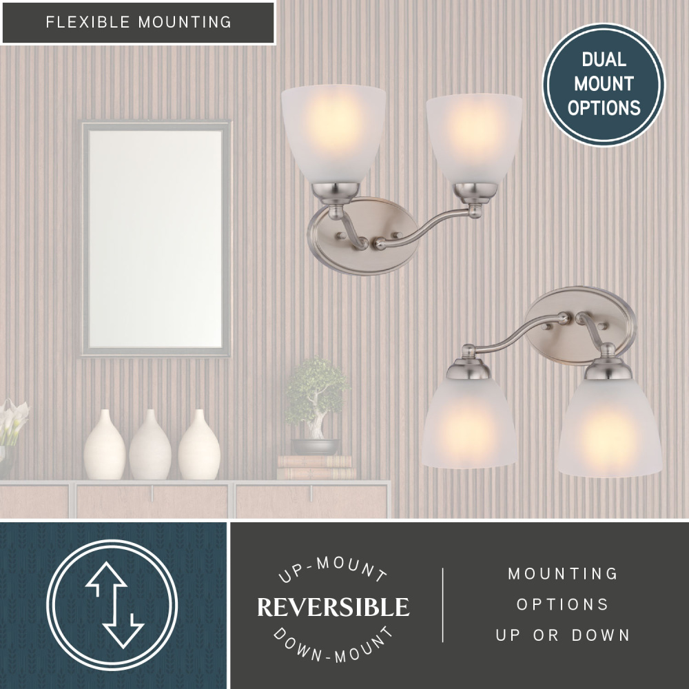 Transform your bathroom's ambiance with the Bellwood 2-light vanity, a perfect blend of classic design and modern sophistication. The satin nickel finish provides a timeless feel, while the frosted glass shades add a touch of vintage charm, diffusing a warm, inviting light. This wall light reimagines traditional style with thoughtfully updated details, including classic sphere accents and graceful tulip glass shades. Damp-rated for lasting performance, the Bellwood vanity is designed to withstand the moisture of bathroom environments. Enhance your daily routine with a fixture that seamlessly bridges traditional charm and modern functionality.