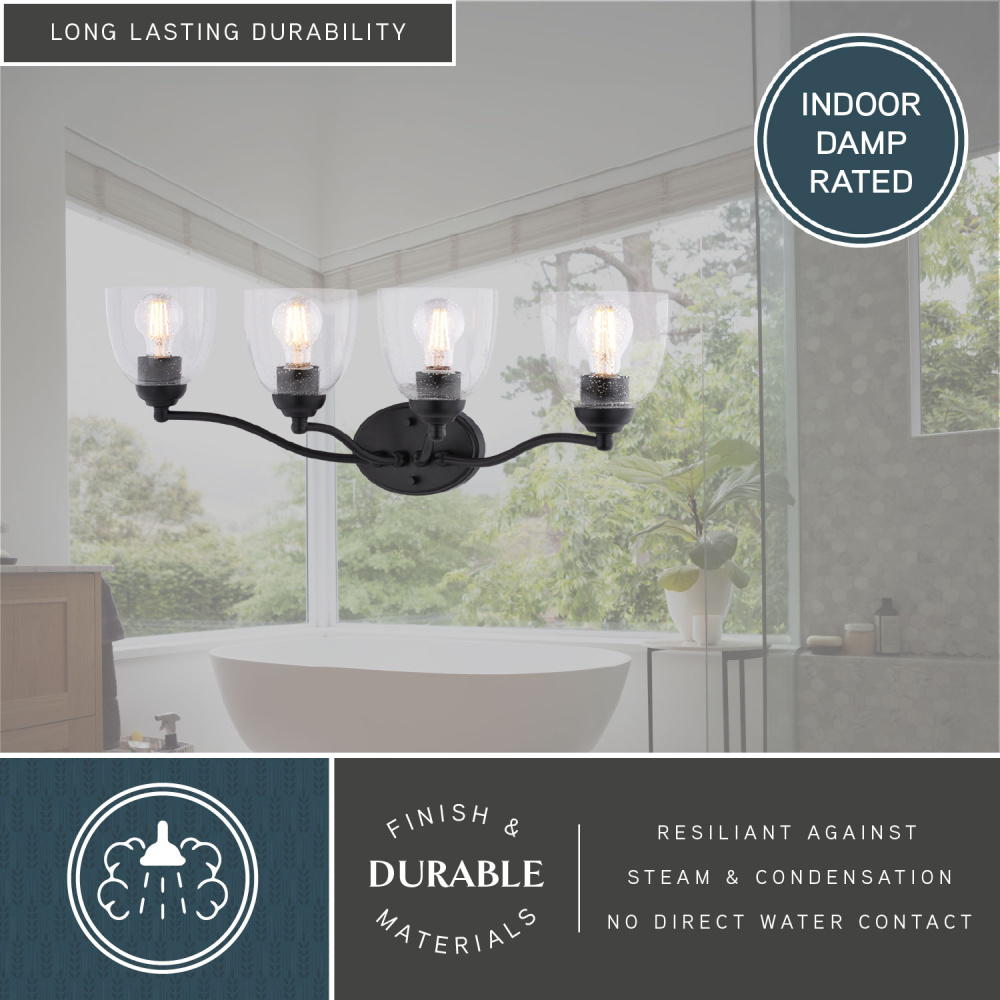 Transform your bathroom's ambiance with the Bellwood 4-light vanity, a perfect blend of classic design and modern sophistication. The matte black finish provides a timeless feel, while the clear seeded glass shades add a touch of vintage charm, diffusing a warm, inviting light. This wall light reimagines traditional style with thoughtfully updated details, including classic sphere accents and graceful tulip glass shades. Damp-rated for lasting performance, the Bellwood vanity is designed to withstand the moisture of bathroom environments. Enhance your daily routine with a fixture that seamlessly bridges traditional charm and modern functionality.
