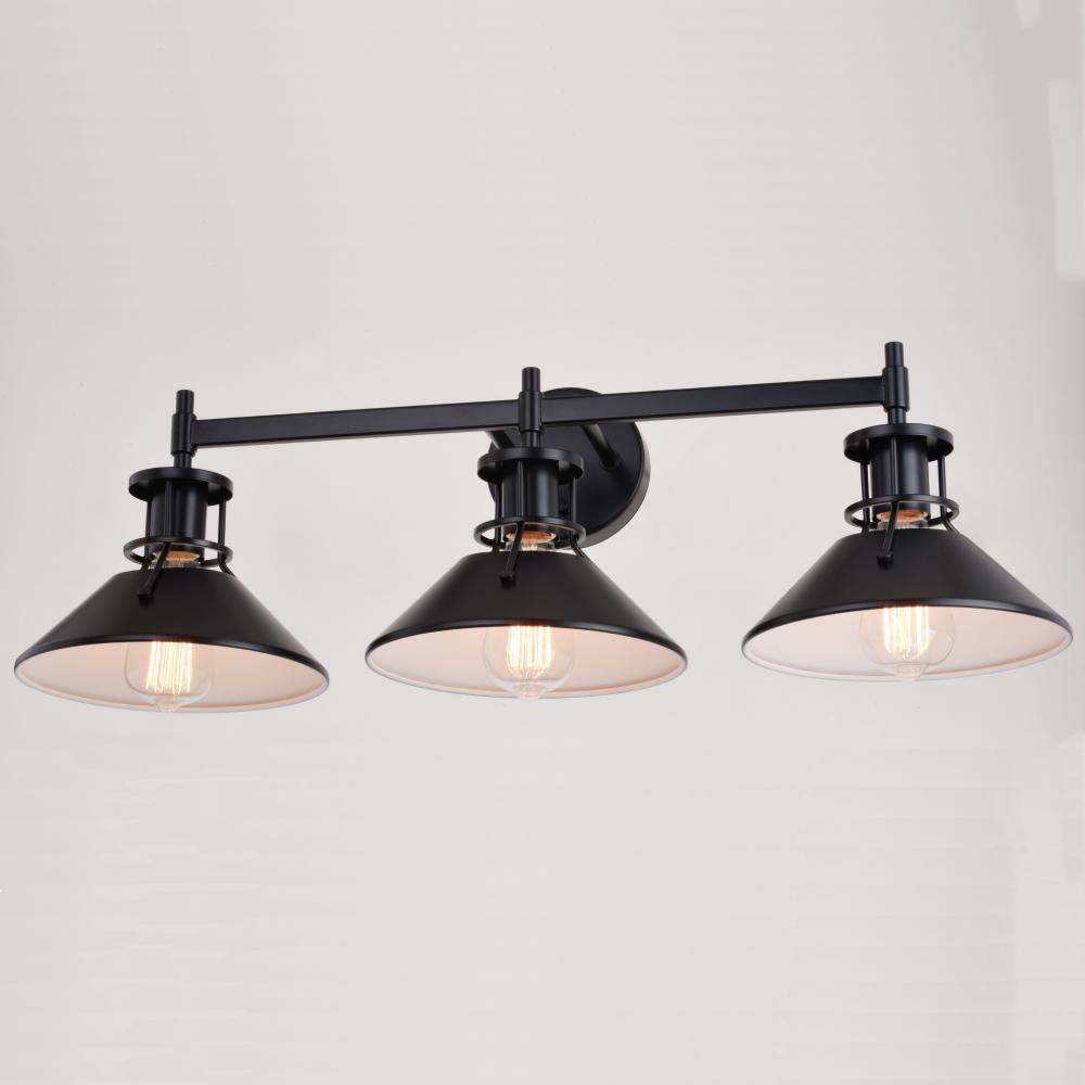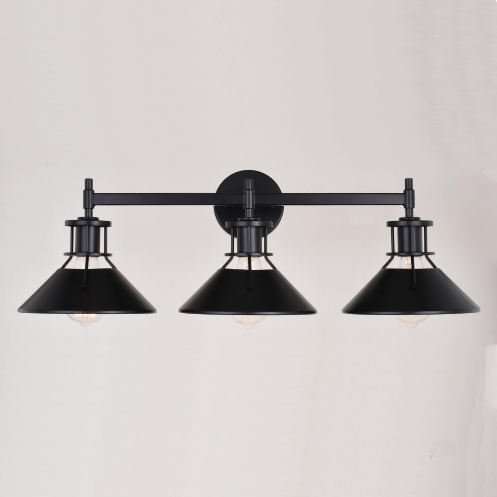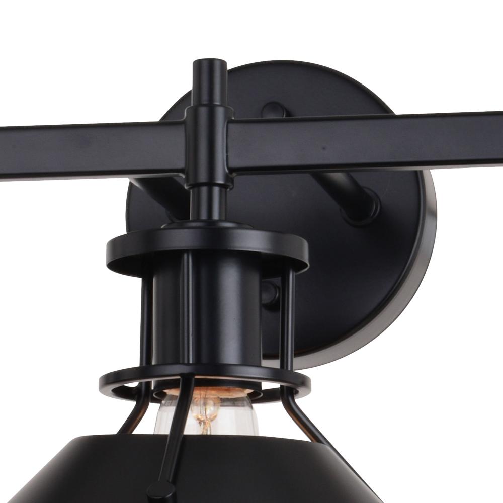 The Canton collection speaks loudly to industrial and farmhouse charm. The black metal shades taper outward to generate the utmost light below. A small cage-like structure allows light to peek out above the shade balancing the show of light. Add this 3-light vanity to any bath, or even a kitchen, for that edgy touch of flair.