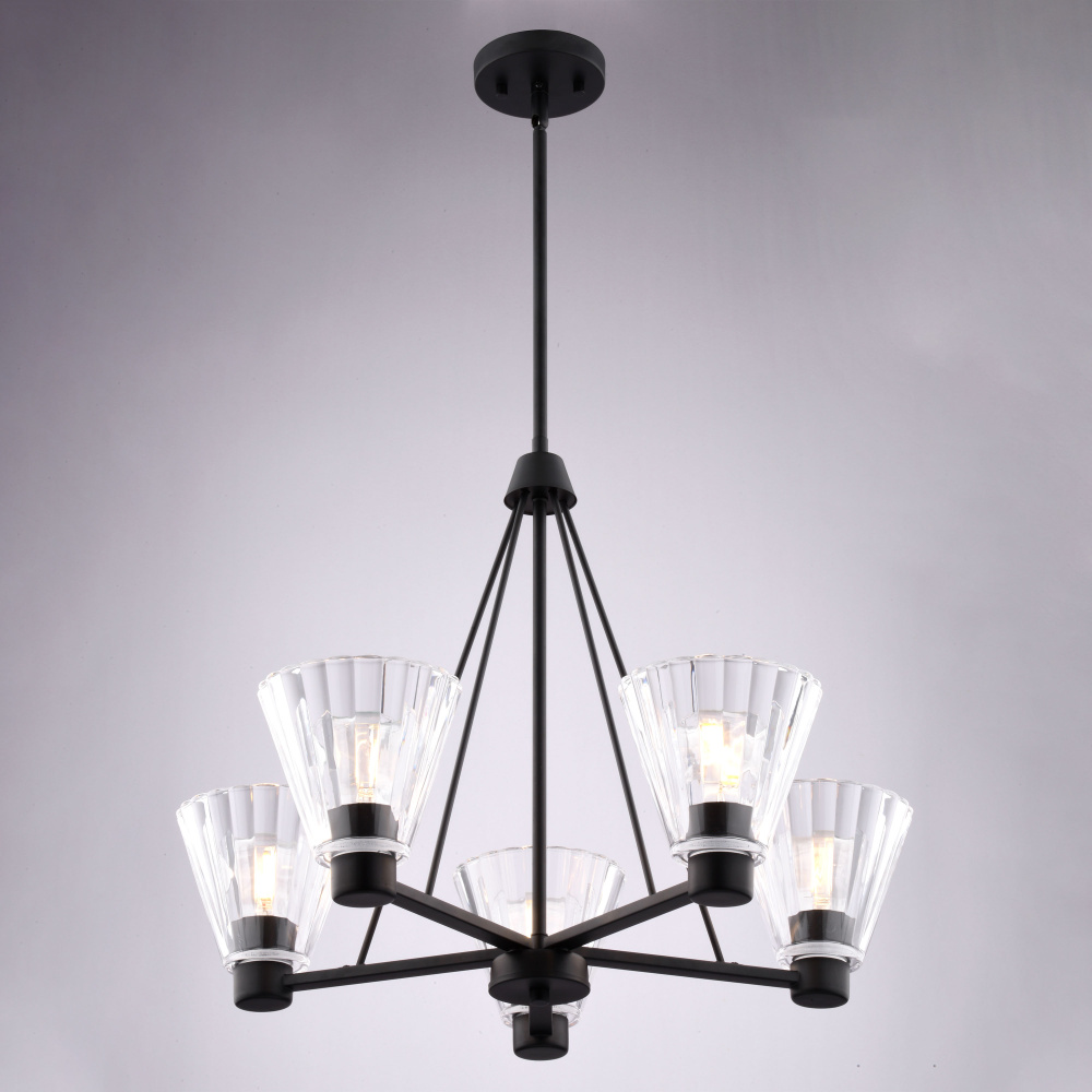 Elevate your dining room or living space with the Dalton 25.5-inch chandelier. Featuring five beautifully crafted fluted glass shades and a sleek matte black finish, this ceiling light fixture makes a striking focal point. The classic, timeless silhouette complements both contemporary and transitional interiors, adding a touch of modern elegance to any room. It's the perfect centerpiece for your dining room, living room, or entryway.