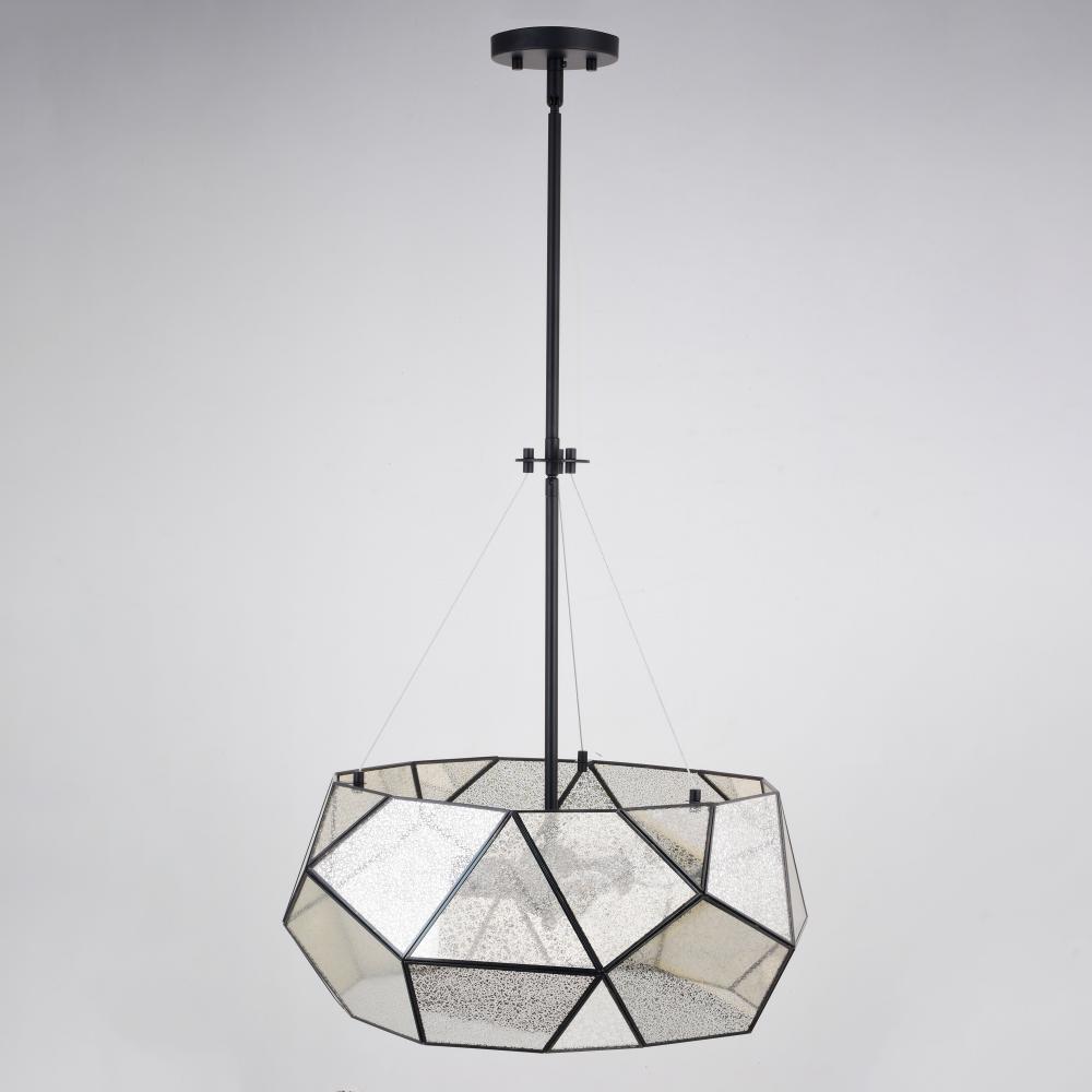 Faceted glass defines the dramatic beauty of the Euclid indoor lighting collection. Black finish pairs with asymmetric panels of mercury glass for a perfect contemporary take on a mid-century modern classic. Combine that with vintage Edison style filament bulbs to complete the look. Height is adjustable with the included downrods; compatible with vaulted ceilings. This pendant would be a stunning addition to any entryway, bedroom, family room, kitchen, dining area, or foyer.