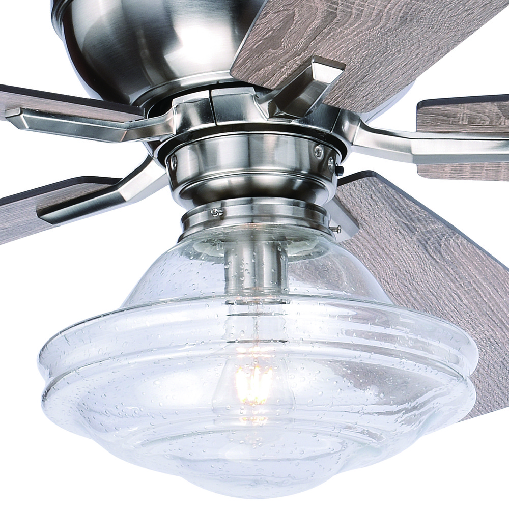 The Huntley is a timeless collection inspired by mid-century small-town aesthetics. The vintage schoolhouse glass is the focal point of this design with its unique profile. Add a vintage Edison style filament bulb to the included light kit to complete the look. This fan is compatible with sloped ceilings and includes a 6 inch down rod (longer down rods sold separately). Remote control included for added convenience.