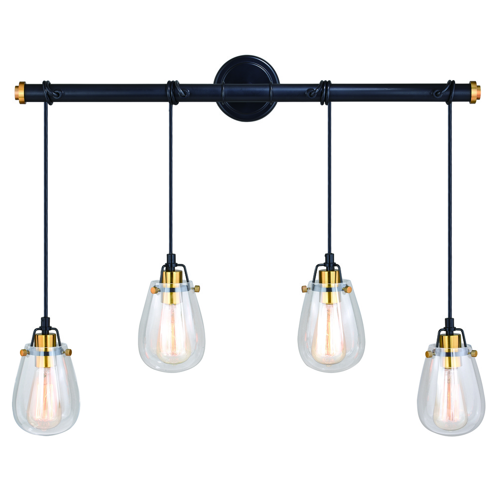 The striking Kassidy collection is a throwback to an industrial time. The distinct black linear lines are punctuated with accents in a natural brass finish. Gently curved teardrop glass shades softly offset the statement this collection makes. Adjustable light heights and lengths enable customizing the look based on your setting. Flexible mounting options let you mount this as an island ceiling pendant or as a bathroom vanity light. Combine that with vintage Edison style filament bulbs to complete the look.