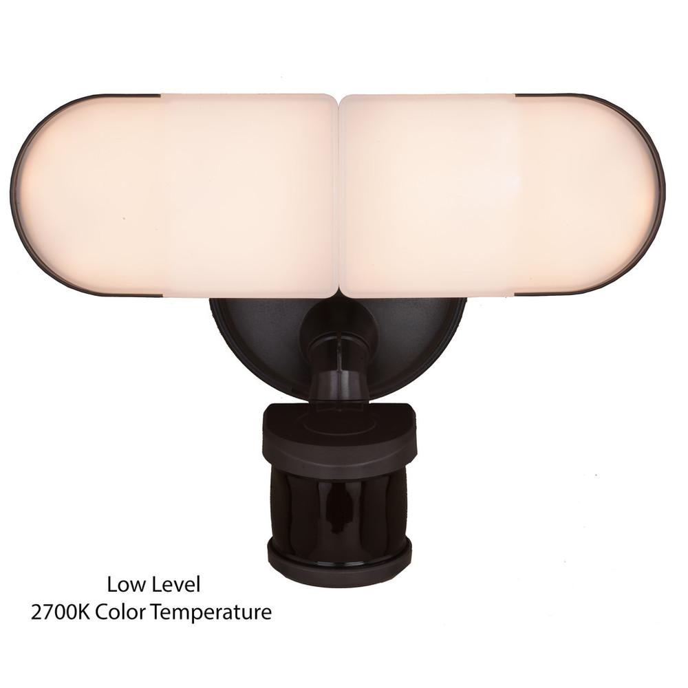 The bronze 2-light Lambda LED outdoor motion sensor security flood light provides the ability to connect multiple security lights into a sync group, so if one in the group detects motion, all will engage with 5000K high level bright light. The modern light heads are fully adjustable and deliver 2,600 lumens to keep your home's exterior brighter at dusk, dimmer with 2700K at night, and instantly bright 5000K when motion is detected. This sync-able dualux security light expands the functionality, safety, and security of your home's outdoor spaces with bright, reliable light when and where it is needed.