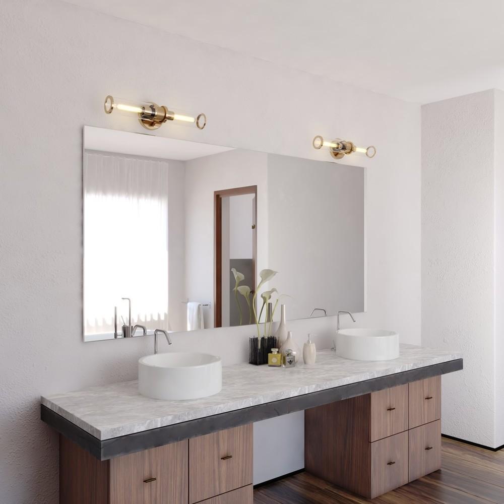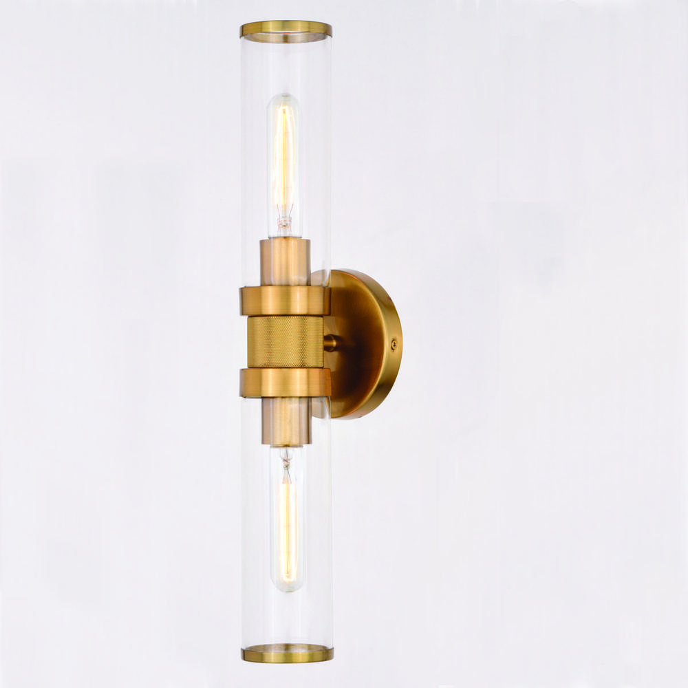 The Levitt sports a handsome look for an industrial loft feel. Clear cylinders of glass extend along a circular satin brass wall plate. The glass ends are accented with a touch of metallic shine. Mount these versatile fixtures horizontally or vertically for the ideal look. The Levitt looks best when paired with a long, tubular bulb. Add this wall light to your trendy bath, hallway or any other walls in your home.