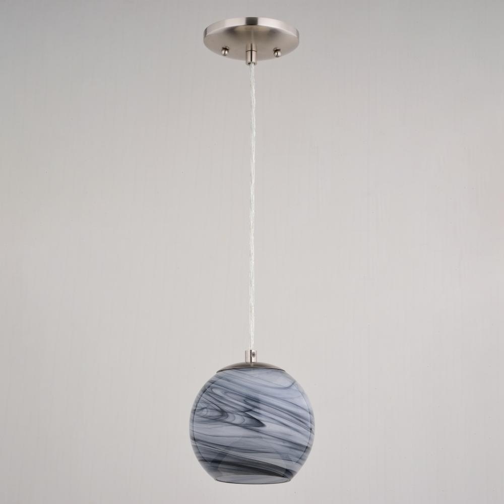 The Milano collection of art glass mini pendant lights feature hand-blown glass which gracefully blend into almost any decor. Because each glass is handcrafted utilizing century-old techniques, no two pieces are identical. The marble swirl colored glass has tones of gray and silver in a rounded globe shape. Accented in an artistic satin nickel finish with matching silver cord which can be cut to size to adjust the hanging height. Install this mini pendant individually or in a grouping; ideal for kitchens, dining areas, or bar areas.