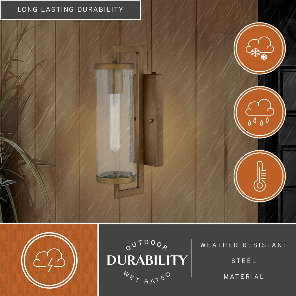 The perfect addition to your outdoor or indoor spaces! A long slim cylinder accentuates the grace and class shown in the Morgan Park collection. A striking warm brass metal frame supports and suspends the clear seeded glass cylinder showcasing a generous display of light. Morgan Park is a clean simple accent suited for any contemporary or mid-century modern decor. A dusk to dawn photo cell automatically turns the wall fixture on in the dark and off in the light for added safety and security, saving energy during daylight hours. Add this wall mount light to any entryway, garage, hallway, or bath for that stylish touch.
