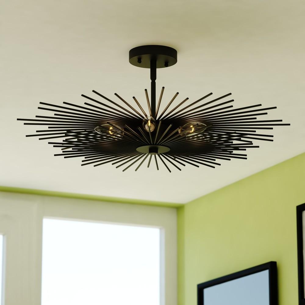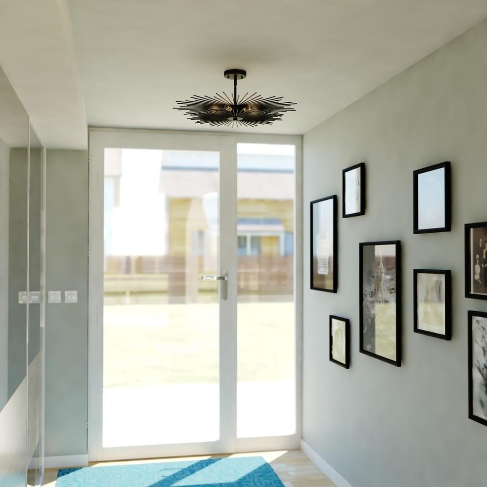 The Nikko collection is bursting with excitement and style. Matte black finished rods playfully radiate from the central band to create an interesting look. This mid-century modern look is a flirty throwback to a simpler age. With its personality and charm, the Nikko semi flush mount ceiling light feels like a familiar friend, sure to make a statement in any entryway, hallway, or bedroom.