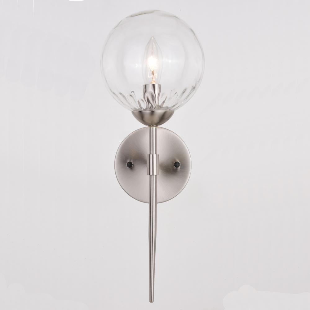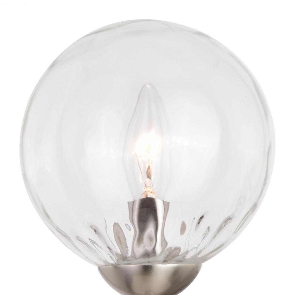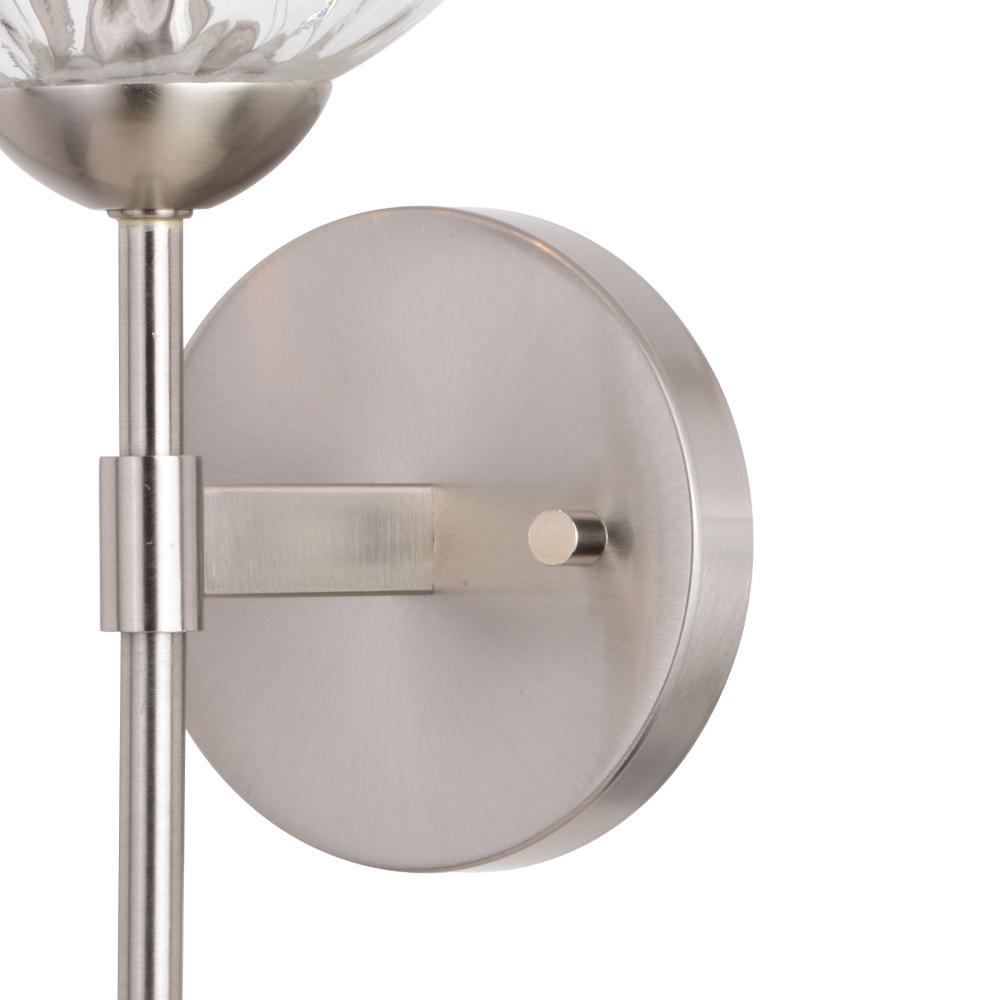 The Olson is a new take on a familiar mid-century modern design. The dimpled clear globe glass shade is supported by a fresh satin nickel rod. Combine that with a vintage Edison style filament bulb to complete the look. This wall sconce is ideal for bathrooms, hallways, stairways, foyers, and more.