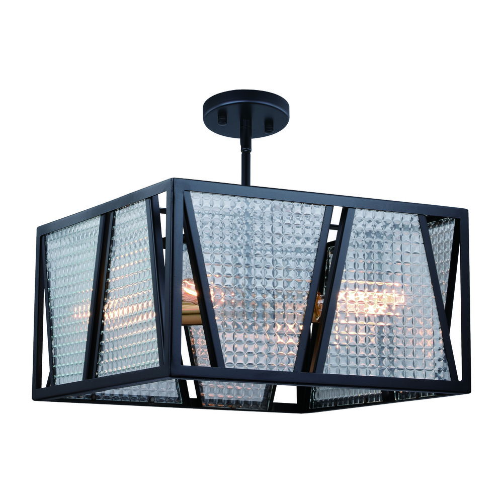 Contemporary styling perfectly paired with soft industrial overtones define the Oslo collection. Alternating tapered glass panes accented by black finished trim are framed in a sleek cage. The beautiful clear checkered glass creates a dramatic lighting effect to any contemporary, or even modern farmhouse, living space. This versatile fixture can be installed two ways; mount as a semi flush ceiling fixture or use the chain to mount as a pendant. Height is adjustable with the included down rods; compatible with sloped ceilings.