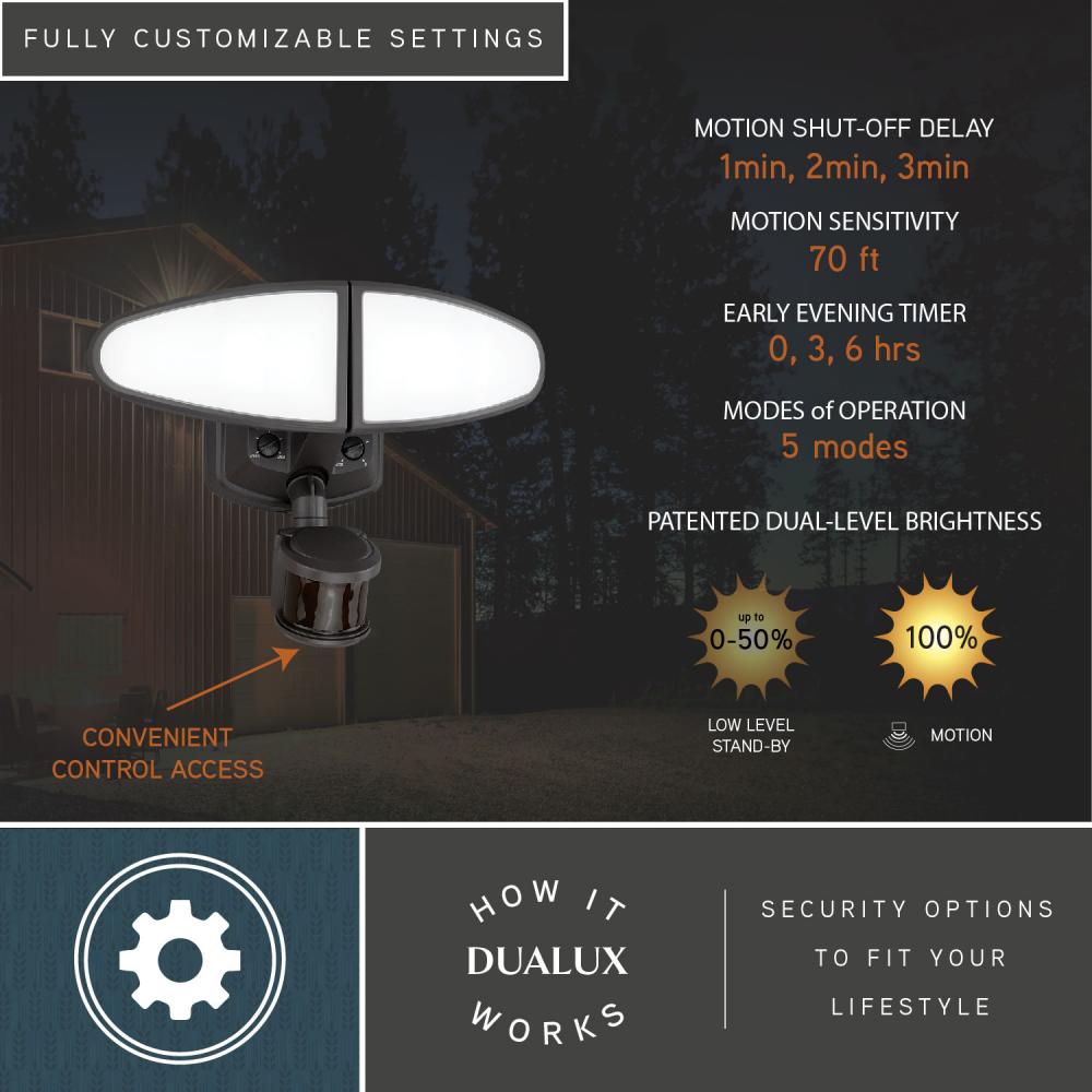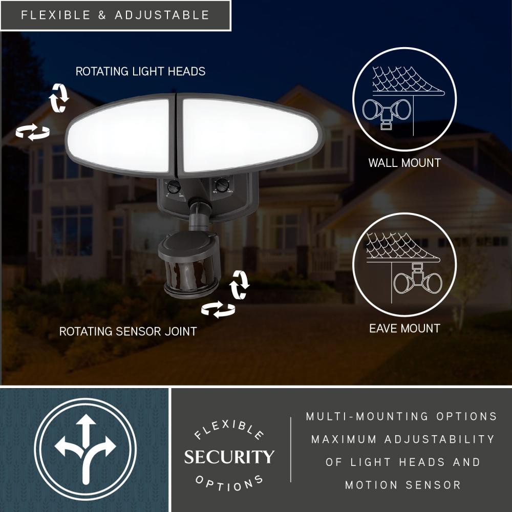The 2-light Palatine LED motion sensor security flood light provides adjustable low level brightness and color temperature while also delivering brilliant 5000K high level illumination when motion is detected. The modern light heads are fully adjustable and deliver 2700 lumens to keep your home's exterior brighter at dusk, dimmer at night, and instantly bright when motion is detected. Integrated battery back-up feature plus eave or wall mount compatible. This dualux security light expands the functionality, safety, and security of your home's outdoor spaces with bright, reliable light when and where it is needed.