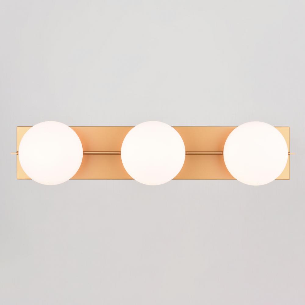 Inspired by mid-century modern art with contrasting geometric shapes, the Parkview collection blends both form and function beautifully. The shades seem to float over the large rectangular back plate and are accentuated by the thin metal divider. This bathroom vanity wall light is finished in satin brass with contrasting frosted opal glass globes. Place this contemporary piece over medium vanities, as a pair over double sinks, or vertically on either side of a mirror.
