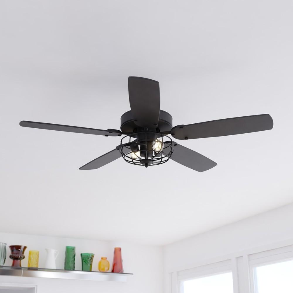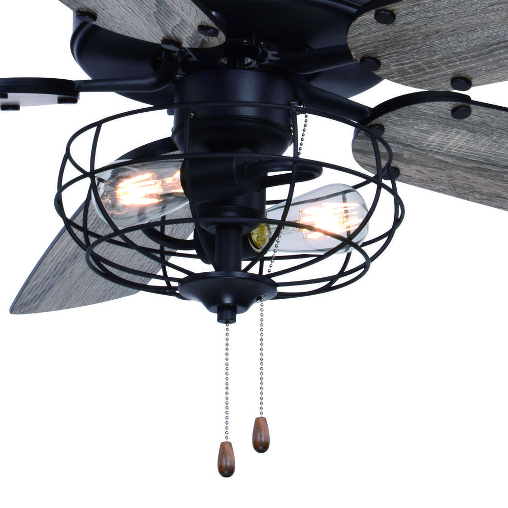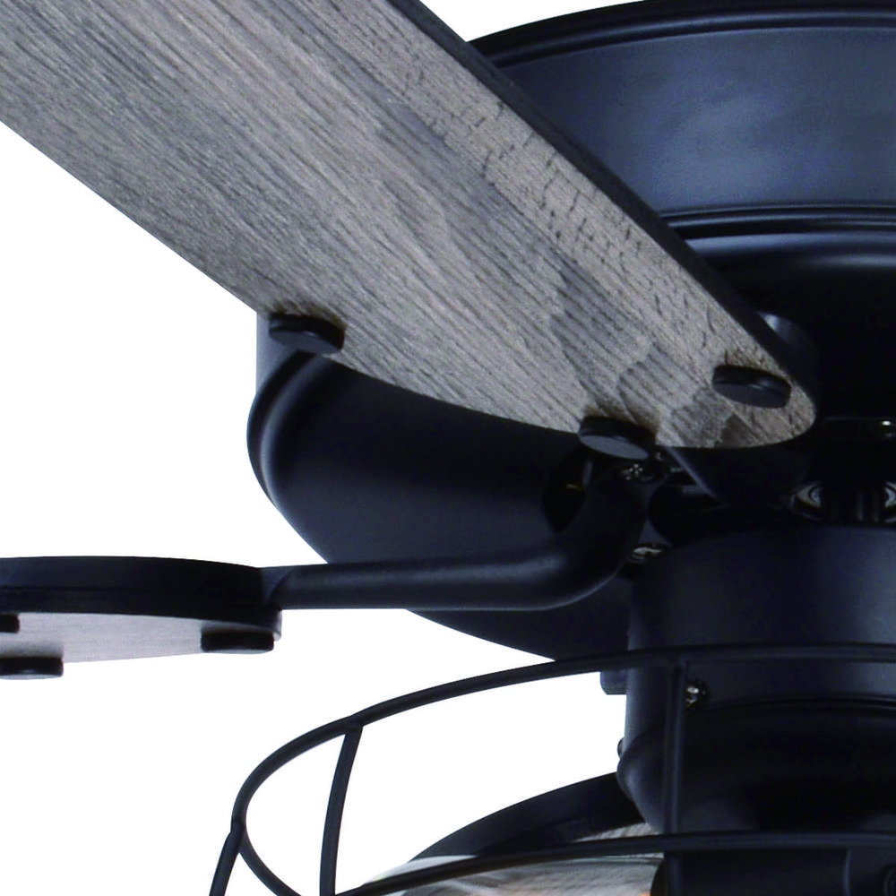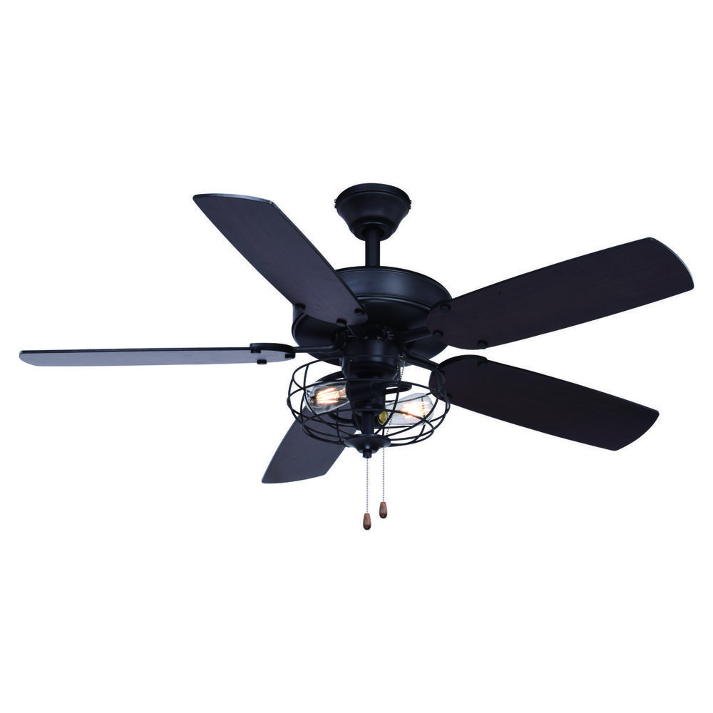 The Reed ceiling fan's matte black finish and included wire cage light kit handsomely complement many decors including farmhouse and industrial. Switch up your look with reversible blades of dark bronze or driftwood colors. Two pull chains operate the light and fan independently. Sloped ceiling compatible and height adjustable with longer downrod (sold separately). Ideal for any bedroom, kitchen or other living area of your home.