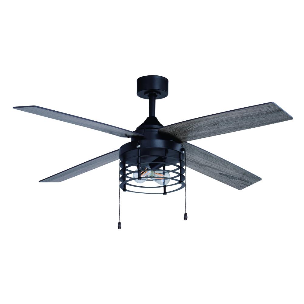 Industrial style is highlighted with the black finish and woven rod drum cage of the 52-in. Rowan ceiling fan. Four reversible blades in black walnut or driftwood offer a customized look which delivers comfort and warmth to your home’s family room, bedroom, dining room or kitchen. Perfect for adding an industrial edge to your transitional decor.