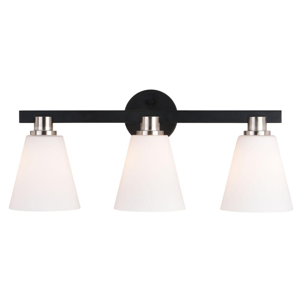 Elegance is exemplified in this collection called Vermont. A simple line of matte black metal acts as a striking backdrop to the etched white glass shades. These generously sized shapes are met with a hint of satin nickel for just the right amount of sheen. Add this understated, but beautiful example of elegance to any trendy bath or other areas of your home.
