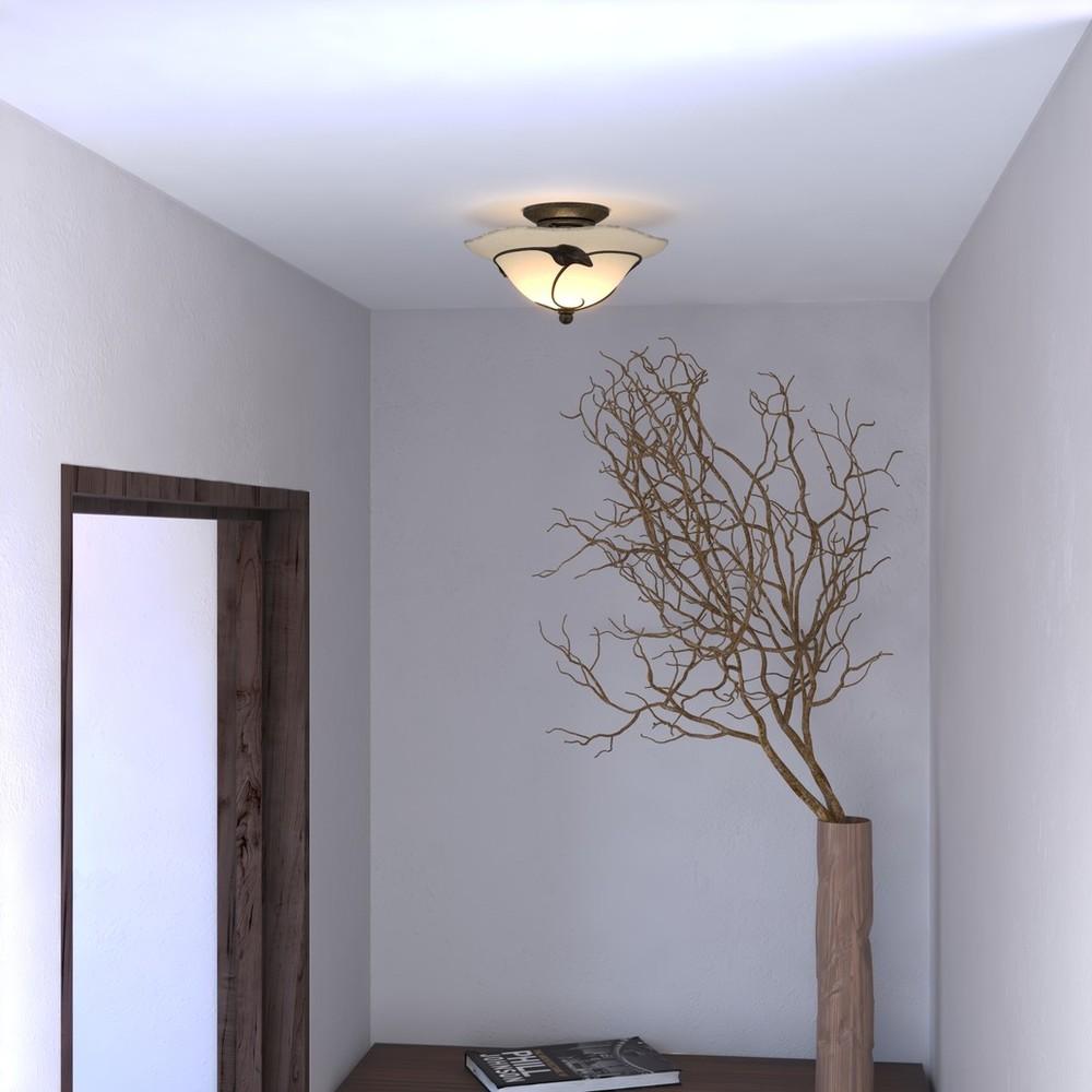 Bring a little of the outdoors inside with the Vine collection. Inspired by nature, this rustic collection features a dark oil shale finish. The amber flake glass shades are scalloped softening the overall feel. Elegantly curved arms are sprinkled with delicately crafted leaves completing the look. This full family of fixtures has something for every room in your home. This semi flush mount ceiling light is ideal for hallways, living rooms, bedrooms, entryways or utility rooms. This versatile fixture can be installed two ways; mount as a ceiling fan light kit (check compatibility with your fan) or as a semi flush ceiling light. Pull chain on-off switch or wall switch controlled.