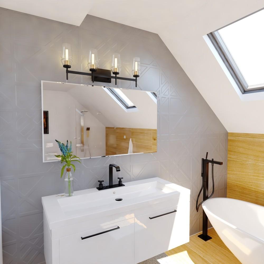 A throwback to mid century modern decor is perfectly represented in the Warren collection. Slightly tapered clear glass shades are evenly spaced along a sleek metal bar. Vertical supports in matte black gives this collection its charm. Memories of years gone by are brought back to life with the brushed brass accents of the Warren collection. Add this vanity wall light to any bath for an on-trend update.