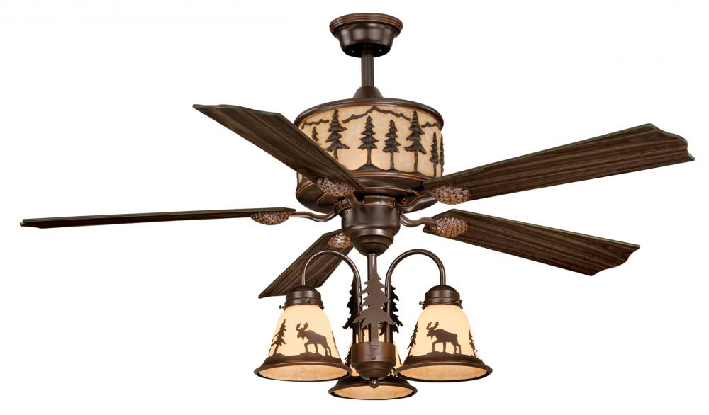 Evoking the spirit of the wilderness, this rustic themed ceiling fan is clad in a burnished bronze finish and features silhouetted tree imagery atop glowing amber flake glass. It a great choice for a vacation lodge, cabin or a suburban home - it will complement a variety of home styles: anywhere you want to bring an element of nature. Add a light kit (sold separately) to brighten up your space. This fan is compatible with sloped ceilings and includes a 6 inch down rod (longer down rods sold separately). Remote control included for added convenience. Blades are reversible; choose between rosewood and dark walnut. Unique lighted motor housing with energy saving LED bulbs (included).