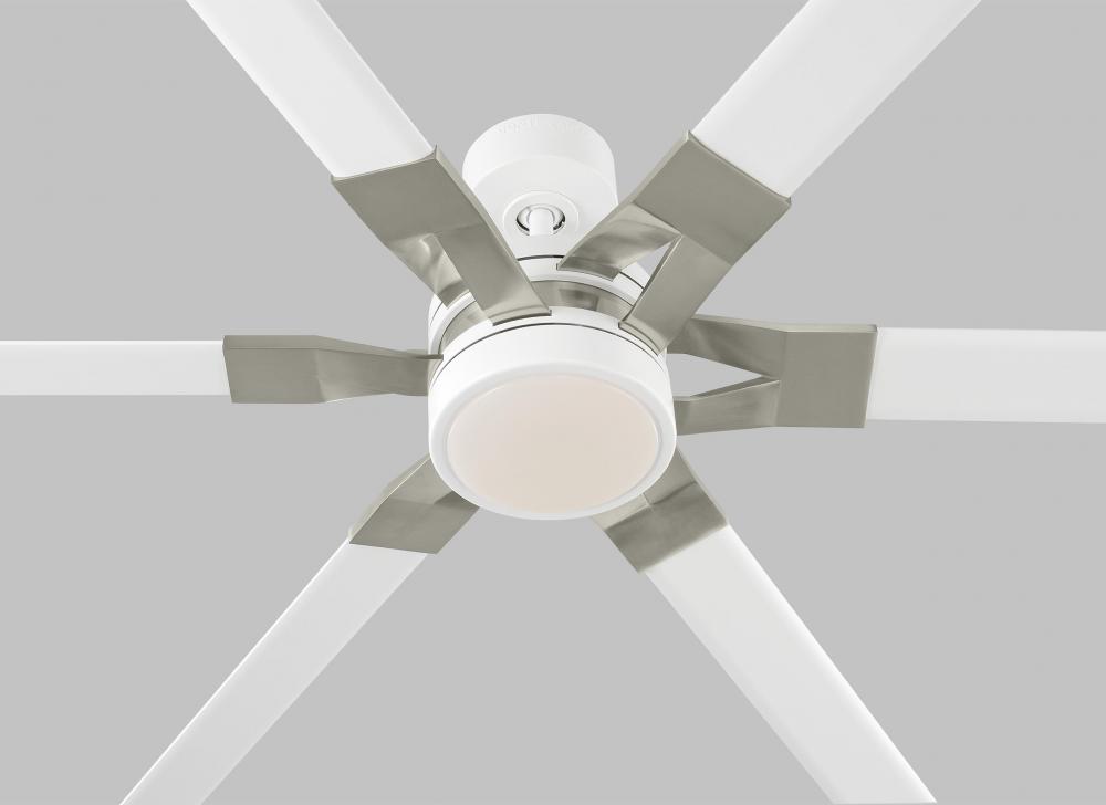 The Sean Lavin Loft 72 in Matte White features a 125.0 X 25.0 6 speed motor with a Thirteen degree blade pitch. With a unique split blade iron design, two-tone finish combinations and extruded aluminum blades, Loft is ideal for modern homes and commercial environments. The large-scale 96” fan has a powerful DC motor that uses minimal electricity and a bright white energy-saving LED downlight. Circulate air and create a strong base of ambient light in your projects with Loft by .