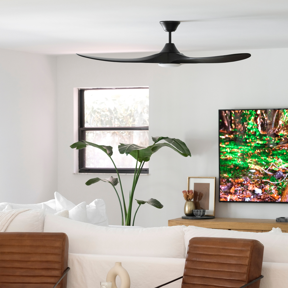 The Maverick 60 LED in Matte Black w Matte Black Blades features an 85.0 X 28.0 6-speed motor with a Thirteen-degree blade pitch. The famous Maverick ceiling fan is now available with an integrated LED light. This advanced LED technology is carefully designed and selected to have the highest quality LED chipsets for superior performance and reliability. With a sleek modern silhouette, a DC motor, and super energy efficiency, the Maverick LED ceiling fan features softly rounded blades and elegantly simple housing. Maverick LED is available in 52, 60, and 70-inch blade sweep and a 3-blade design that delivers a distinct profile and incredible airflow for living rooms, great rooms, or outdoor covered areas. It includes a hand-held remote with six speeds and reverses. All versions feature beautiful hand-carved balsa wood blades. ENERGY STAR qualified. Maverick fans are damp-rated. A