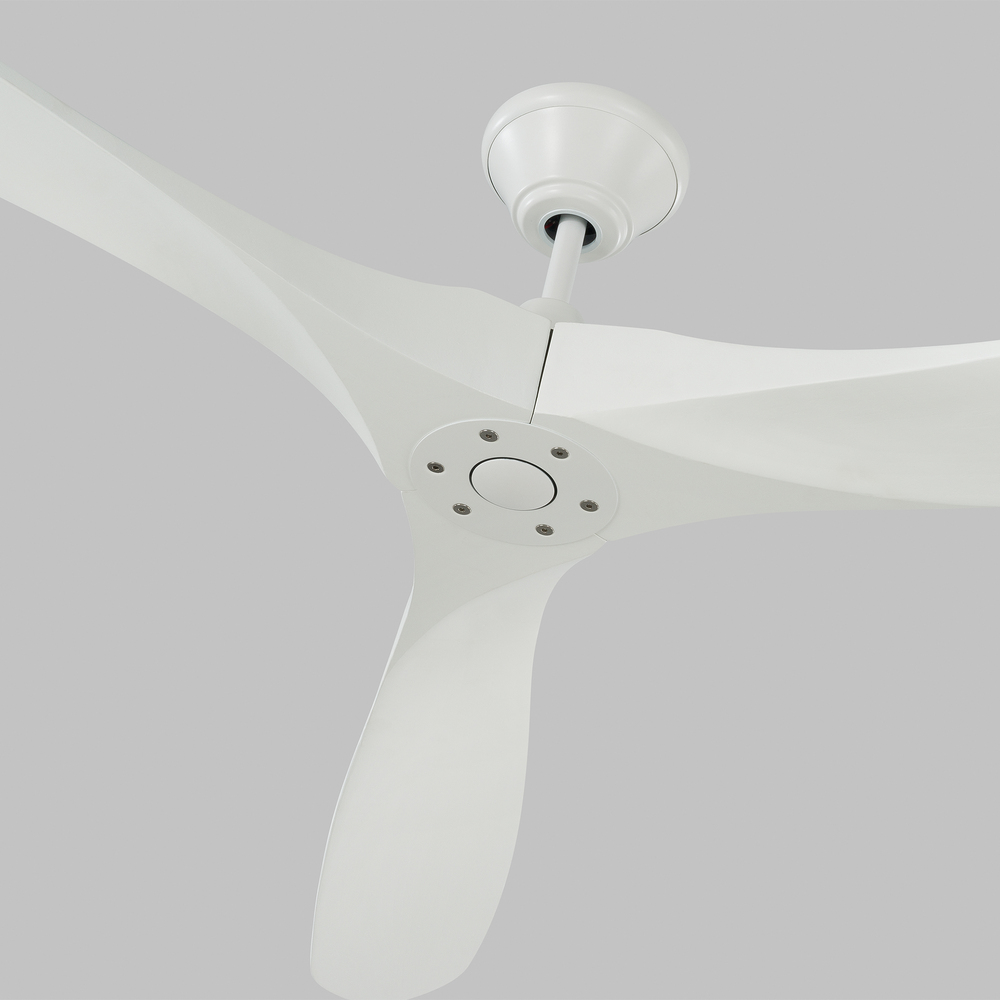 The Maverick 88 in Matte White features a 120.0 X 25.0 6 speed motor with a Thirteen degree blade pitch. With a sleek modern silhouette, a DC motor and super energy-efficiency, the 88" Maverick Super Max ceiling fan from features softly rounded blades and elegantly simple housing. Maverick Super Max has an impressive 88-inch blade sweep and a 3-blade design that delivers a distinct profile and incredible airflow for extra-large living rooms, great rooms or outdoor covered areas. It includes a hand-held remote with six speeds and reverse, and is available in six distinct finish options: Brushed Steel housing with Dark Walnut blades, Brushed Steel housing with Koa blades, Matte Black housing with Dark Walnut Blades, Aged Pewter housing with Light Grey Weathered Oak blades, Matte Black housing with Matte Black blades and Matte White housing with Matte White blades. All versions feature beautiful hand-carved, balsa wood blades.