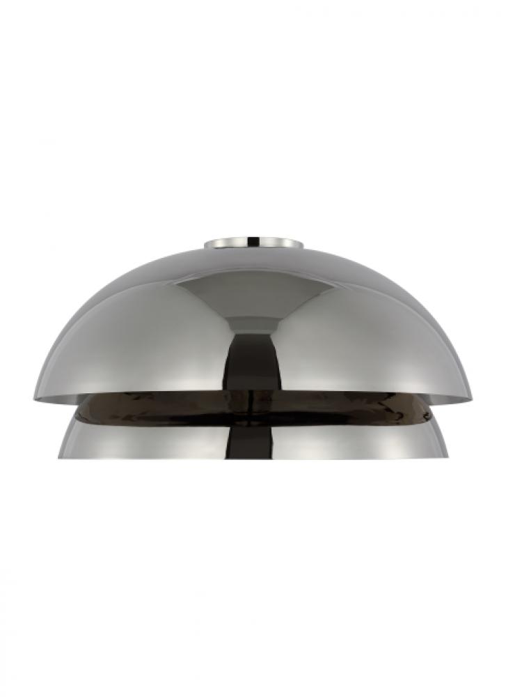 "The Shanti by Sean Lavin is a statement-making piece you’ll want to set the tone in your foyer, living room, or dining room. The design presents a fresh visual you can indulge in from any angle you look at it. Hanging from the end of a simple stem is a set large spun metal-shaped shades. Light sends the piece to another level as the multi-directional bulbs glaze the structure while creating a warm, radiant glow. Integrated LED modules bring the metal to life as they emit a bright and even layer of light through the top and bottom of the piece.