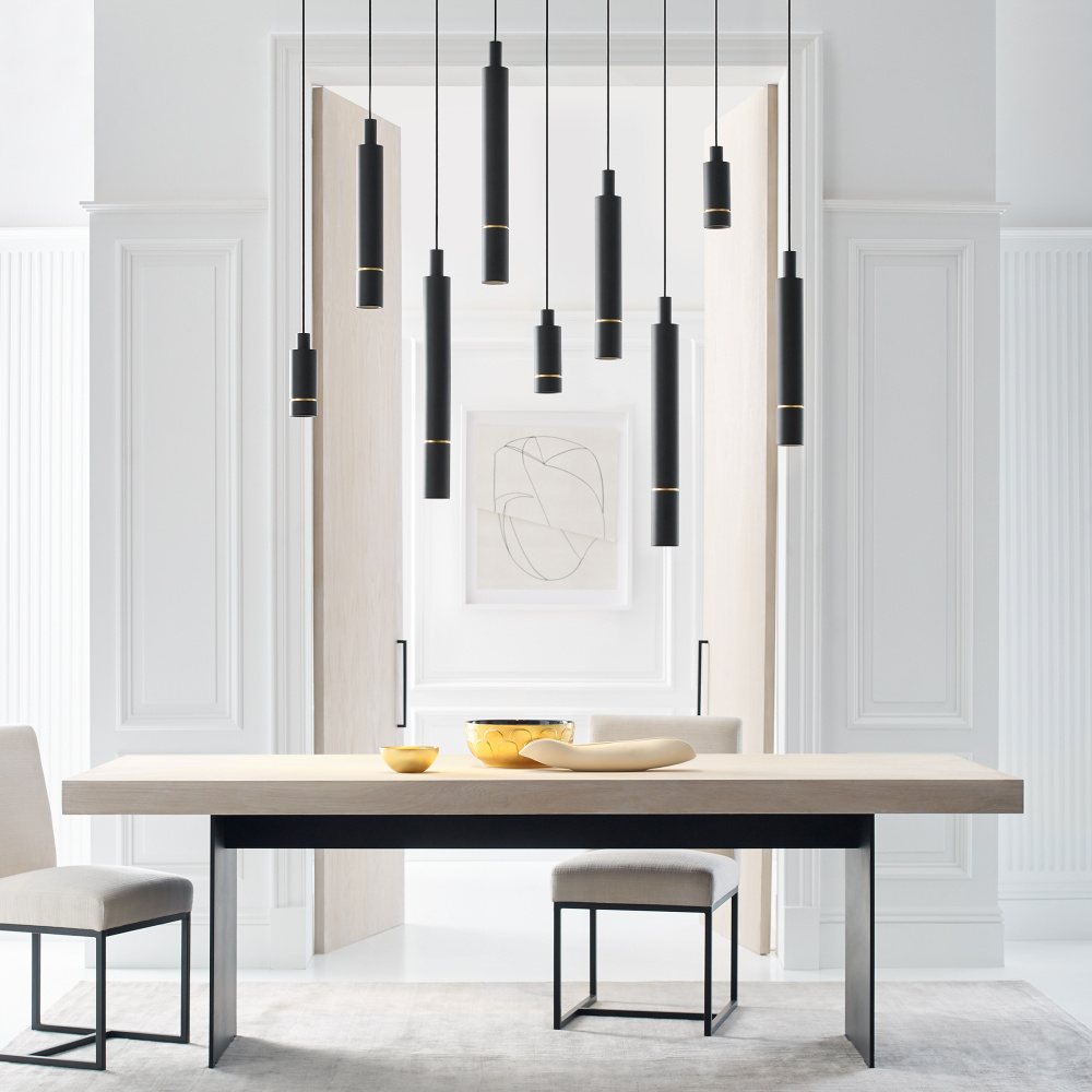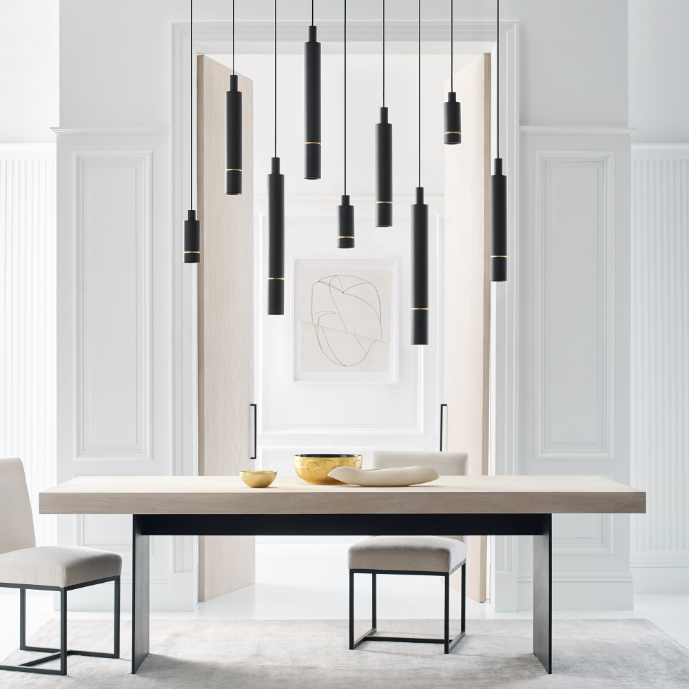 The Sottile X-Large Pendant by Mick De Giulio for Visual Comfort Modern takes the classic contemporary, sleek metal cylinder and gives it a fresh new upgrade by featuring either a complementary or contrasting recessed reveal. Each pendant ships with three ring details (Natural Brass, Nightshade Black and Polished Nickel) to either match the rest of the pendant or add striking, yet subtle contrast.